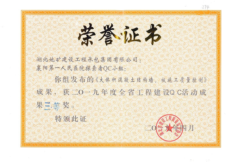 襄陽第一人民醫(yī)院探索者QC小組獲2019年度全省工程建設(shè)QC活動成果三等獎