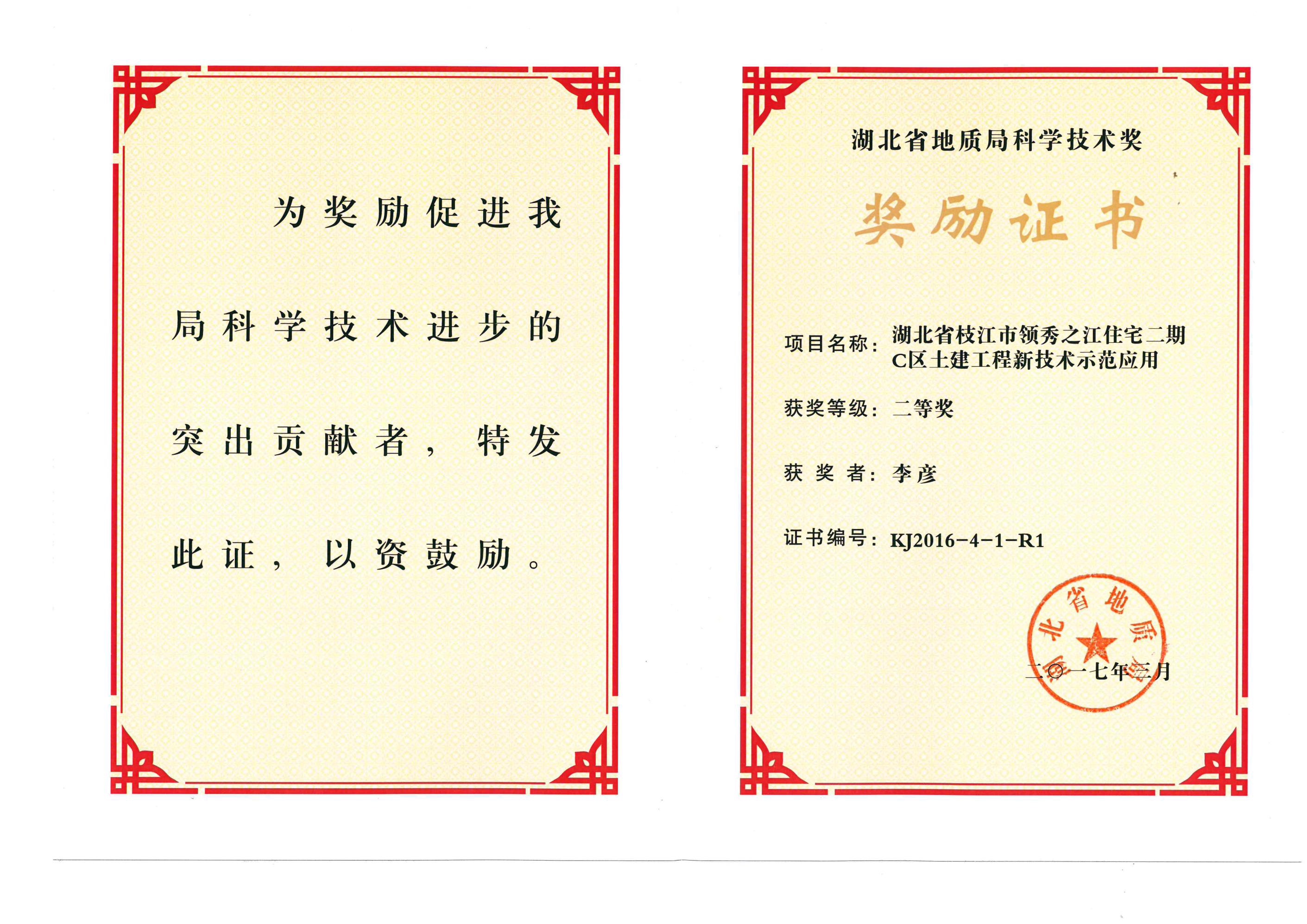 湖北省地質(zhì)局科學(xué)技術(shù)獎(jiǎng)(枝江市領(lǐng)秀之江住宅 李彥)