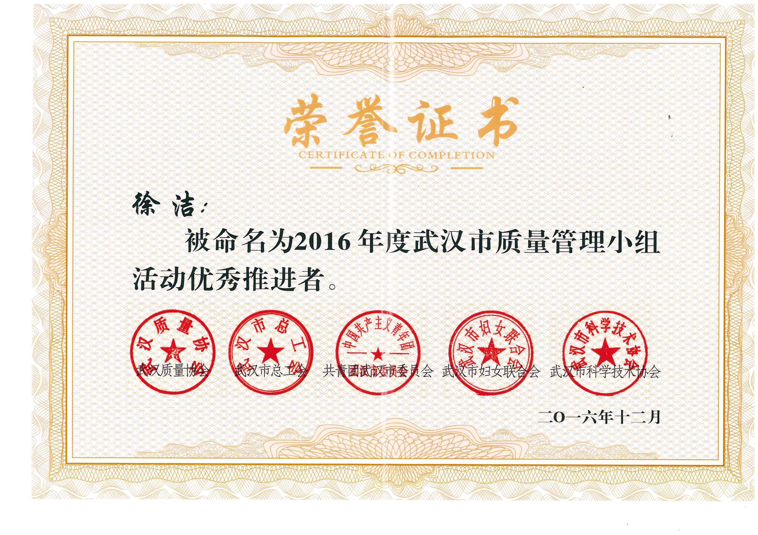 李彥被命名為2016年度武漢市質(zhì)量管理小組活動(dòng)優(yōu)秀推進(jìn)者