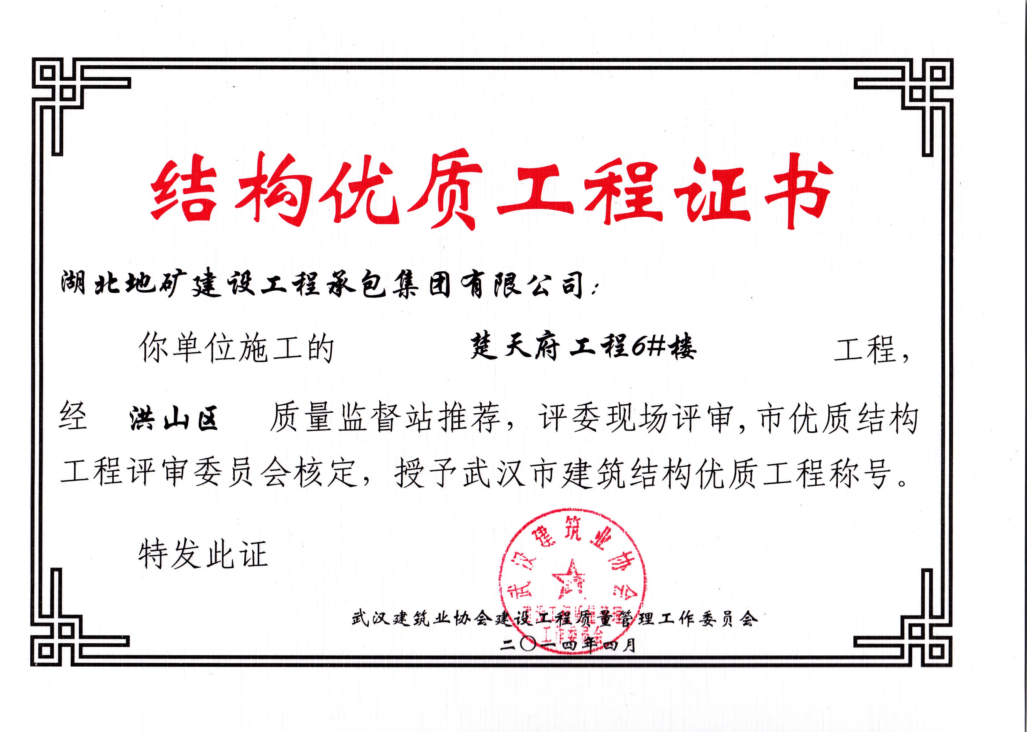 承包公司楚天府6#樓武漢市建筑結(jié)構(gòu)優(yōu)質(zhì)工程