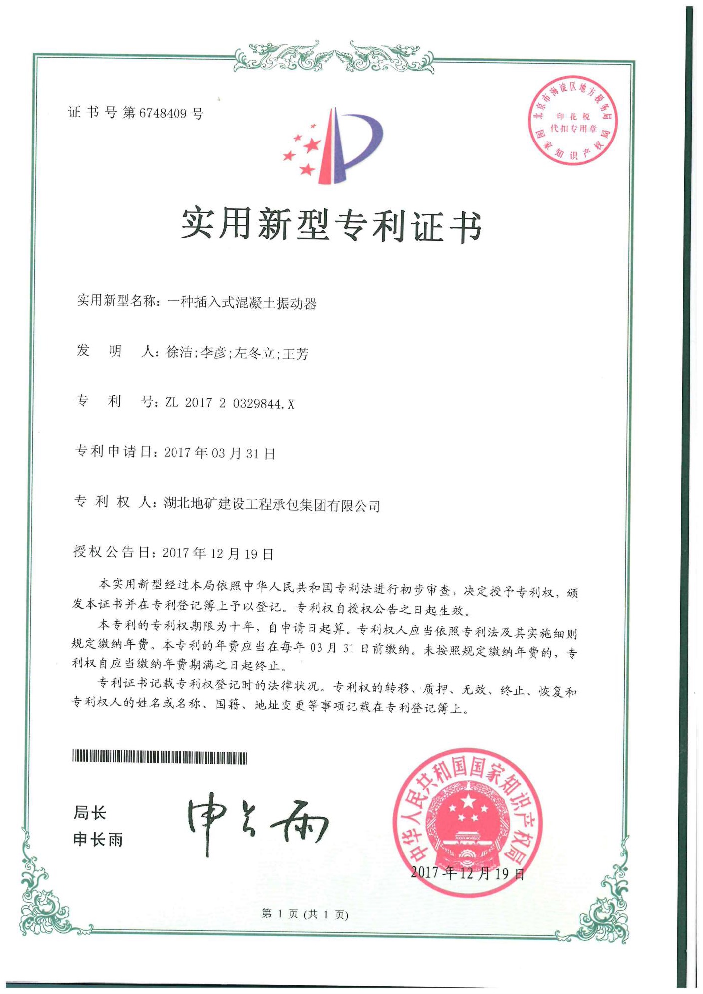 2017年專利證書