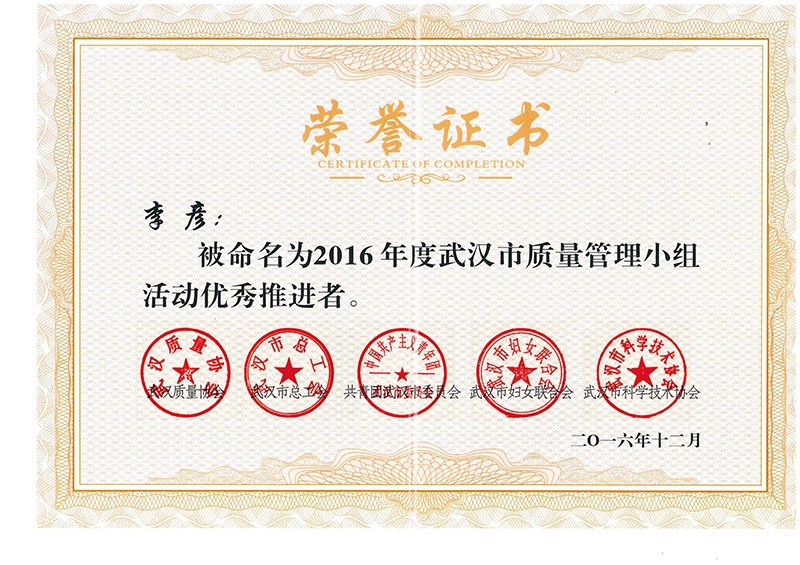 李彥被命名為2016年度武漢市質(zhì)量管理小組活動(dòng)優(yōu)秀推進(jìn)者