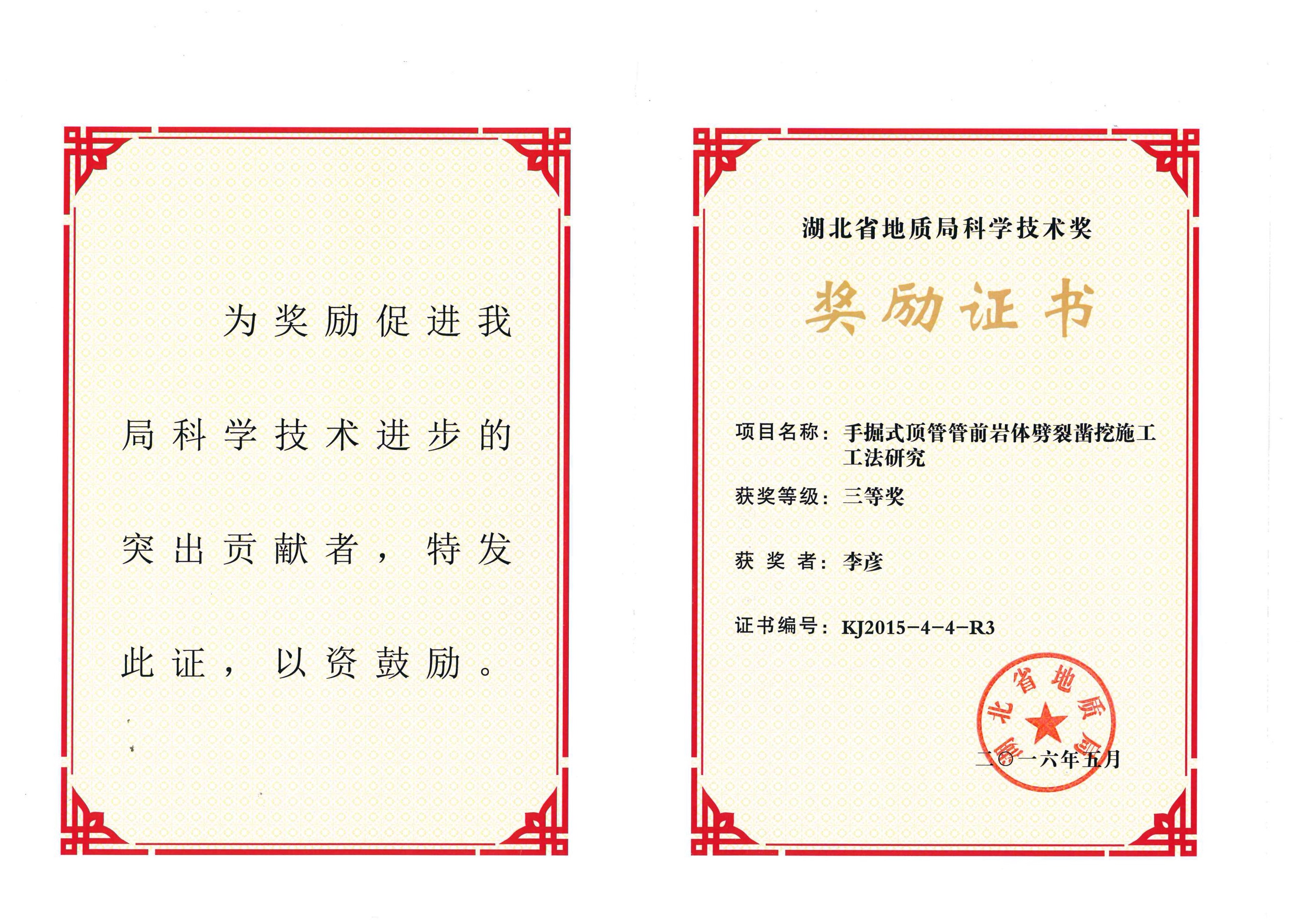 手掘式頂管管鉗巖體劈裂鑿?fù)谑┕すしㄑ芯揩@得湖北省地質(zhì)局科學(xué)技術(shù)三等獎(jiǎng)(李彥)