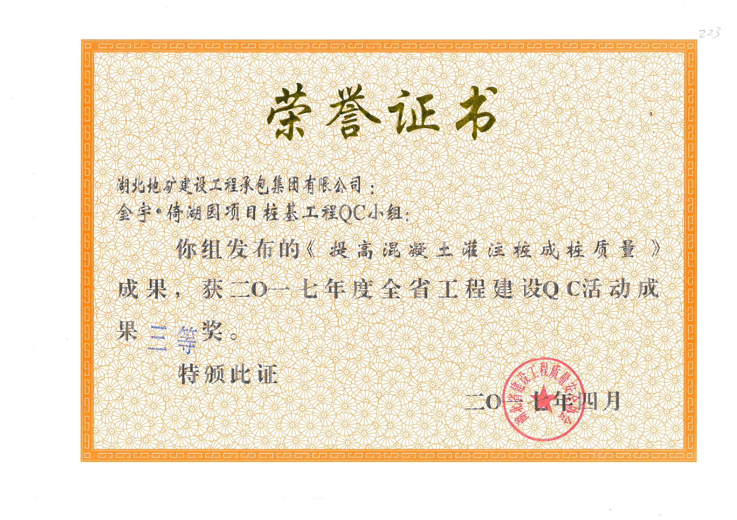 金宇依湖園《提高混凝土灌注樁成樁質(zhì)量》獲得QC成果三等獎(jiǎng)