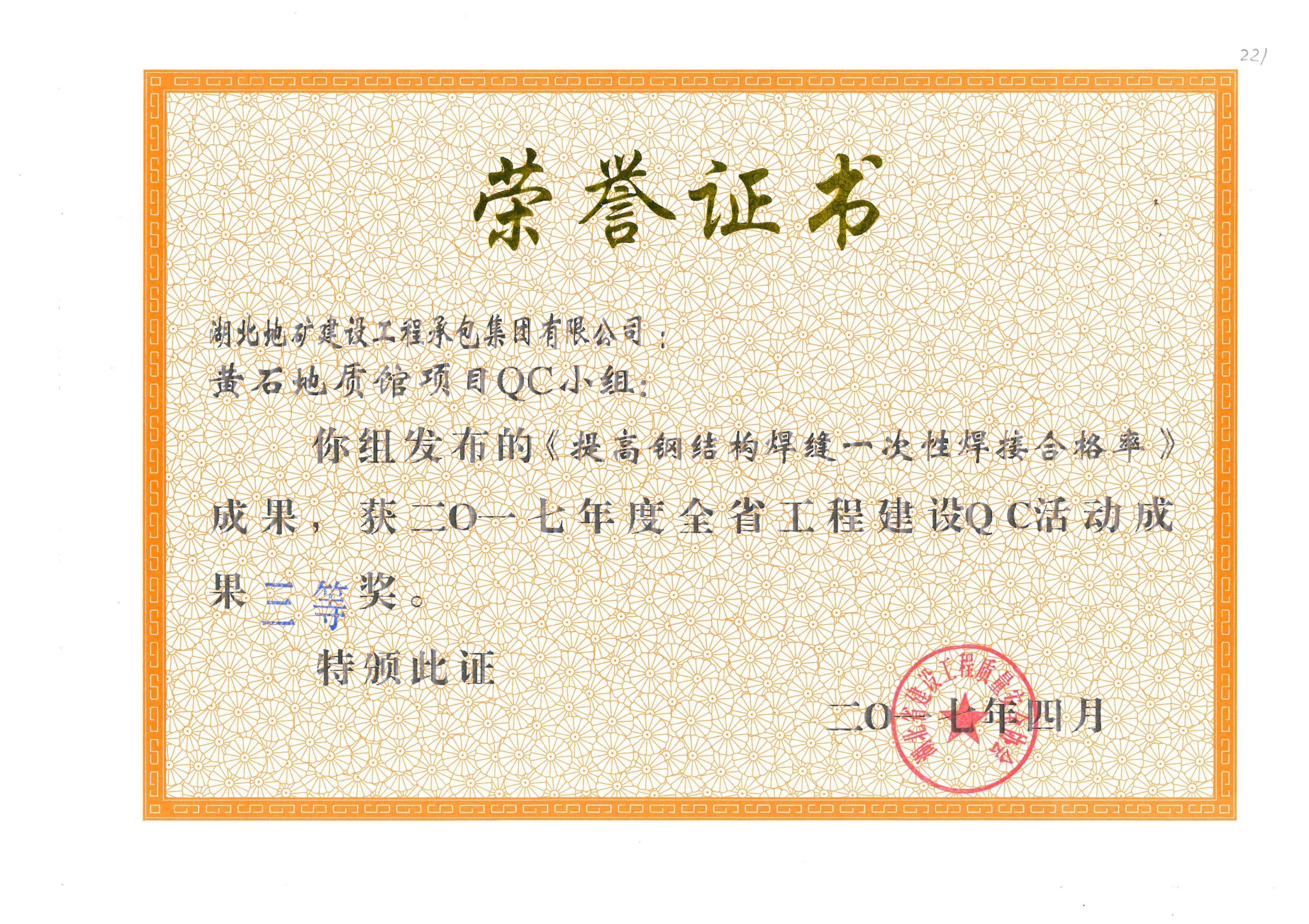 黃石地質(zhì)館《提高鋼結(jié)構(gòu)焊縫一次性焊接合格率》獲得QC成果三等獎(jiǎng)
