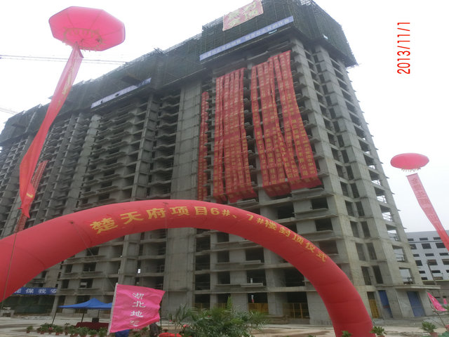 2013年11月1日上午,楚天府項目部6#、7#樓正式完成主體結(jié)構(gòu)的封頂。