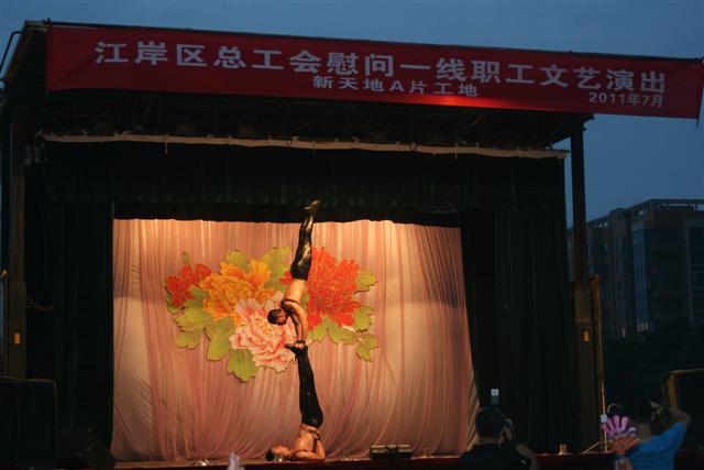 2011年7月14日晚,江岸區(qū)總工會在武漢地質(zhì)勘察基礎工程有限公司瑞安A1A2A3地塊樁基項目施工現(xiàn)場舉辦慰問一線職工文藝演出。來自武漢劇院藝術(shù)家們表演的舞蹈、獨唱、雜技、魔術(shù)、川劇變臉等一個個精彩紛呈的節(jié)目,博得了一陣陣熱烈的掌聲。特別是當演員們走下臺來與觀眾互動,邀請觀眾對唱時,現(xiàn)場氣氛更是鼎沸歡騰。