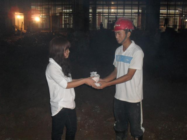 圖為后勤部同志為顧不上吃晚飯的員工送去盒飯