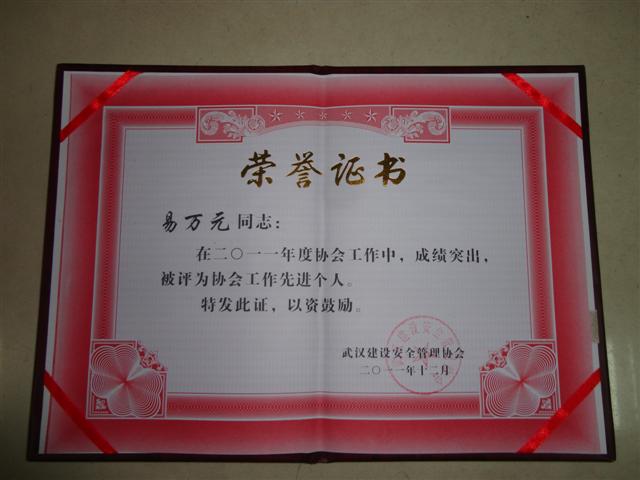 2011年12月30日,在武漢市委會(huì)議中心召開的2011年度武漢建設(shè)安全管理協(xié)會(huì)年會(huì)上,武基公司榮獲2011年度協(xié)會(huì)工作先進(jìn)單位,公司總經(jīng)理易萬元被評為2011年度協(xié)會(huì)工作先進(jìn)個(gè)人榮譽(yù)稱號。
