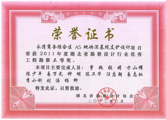 武基公司永清商務綜合區(qū)A5地塊深基坑支護設計項目榮獲2011年度湖北省勘察設計行業(yè)優(yōu)秀工程勘察三等獎