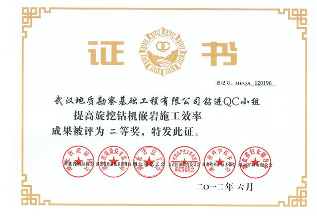 武基公司鉆進(jìn)QC小組《提高旋挖鉆機(jī)嵌巖施工效率》成果被評為二等獎,勘察公司礦山環(huán)境治理QC小組《提高高陡巖石坡面客土噴播綠化覆蓋率》成果被評為三等獎,地建承包公司新星小組《附著式升降腳手架安全防護(hù)新工藝施工》被評為優(yōu)等獎。武基公司鉆進(jìn)QC小組、勘察公司礦山環(huán)境治理QC小組和地建承包公司新星小組均被評為“湖北省優(yōu)秀質(zhì)量管理小組”。