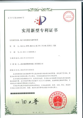 7月4日,武漢地質(zhì)勘察基礎(chǔ)工程有限公司申報(bào)的“地下連續(xù)墻接頭刷壁裝置”和“ 逆作法鋼管柱自動(dòng)調(diào)垂裝置”被國(guó)家知識(shí)產(chǎn)權(quán)局授予實(shí)用新型專利。