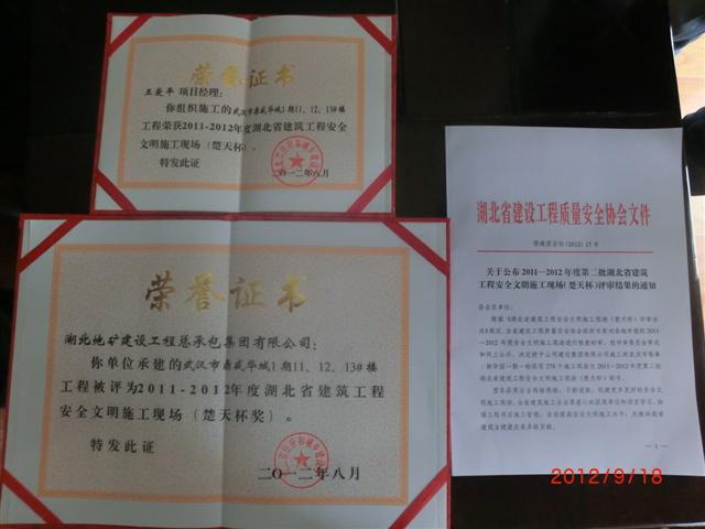 作為地建承包公司的一個文明施工窗口,該工程項目部通過良好的管理、有效的措施和科學(xué)合理的施工安排滿足了文明施工、環(huán)境保護(hù)、現(xiàn)場安全防護(hù)、擾民控制、材料設(shè)備進(jìn)出場以及政府部門對施工管理的相關(guān)要求,接受了來自建設(shè)、施工、監(jiān)理、政府等部門對項目現(xiàn)場進(jìn)行的全方位考評,得到了各方好評,并最終獲得了這項湖北省建筑行業(yè)安全文明施工的最高榮譽(yù)。