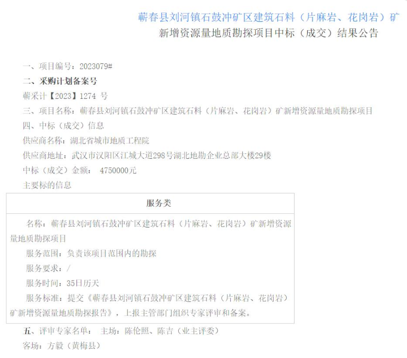 2023年9月,承包公司深入學習貫徹習近平總書記給山東省地礦局第六地質(zhì)大隊重要回信精神,按照省委省政府“發(fā)揮地質(zhì)作用”“展現(xiàn)更大作為”重要要求,深入貫徹落實院“項目經(jīng)營年”活動,切實履行公益職能,生態(tài)地質(zhì)環(huán)境科技分公司中標蘄春縣劉河鎮(zhèn)石鼓沖礦區(qū)建筑石料(片麻巖、花崗巖)礦新增資源量地質(zhì)勘探項目(中標金額475萬元)和十堰鄖西縣上津鎮(zhèn)扒山溝礦區(qū)建筑用白云巖礦勘探項目(中標金額197.5萬元)。