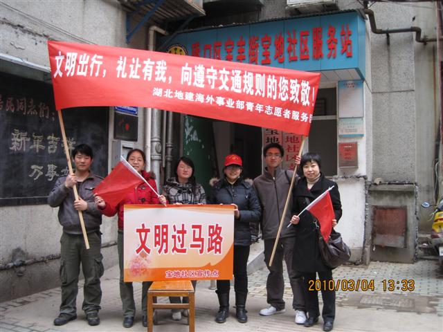 為了迎接3.5“中國青年志愿者服務(wù)日”,湖北地建海外事業(yè)部團支部聯(lián)絡(luò)了硚口區(qū)寶地社區(qū)居委會,組織員工于3月4日13:00前往建設(shè)大道云都酒店路口進行“文明過馬路”主題宣傳活動?;顒拥玫饺w在漢員工的積極響應(yīng),大家紛紛帶上小紅帽、挽起宣傳章、拿上小紅旗,成為一名光榮的志愿者,為路人提供了熱情周到的服務(wù)。