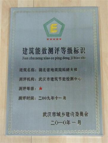 經(jīng)武漢市建筑節(jié)能檢測(cè)中心測(cè)評(píng),湖北地建承包公司承建的湖北省地調(diào)大樓項(xiàng)目被武漢市建委授予建筑能效一星級(jí)標(biāo)識(shí)牌。