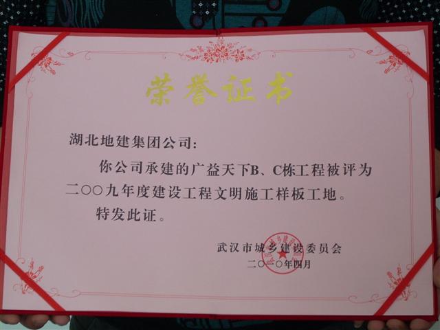 2010年4月,廣益·天下B、C棟項(xiàng)目榮獲2009年度建設(shè)工程文明施工樣板工地榮譽(yù)稱號(hào),同時(shí),該項(xiàng)目經(jīng)理張煥生被評(píng)為武漢市2009年度建設(shè)工程文明施工管理優(yōu)秀項(xiàng)目經(jīng)理,武漢市城鄉(xiāng)建設(shè)委員會(huì)頒發(fā)榮譽(yù)證書。