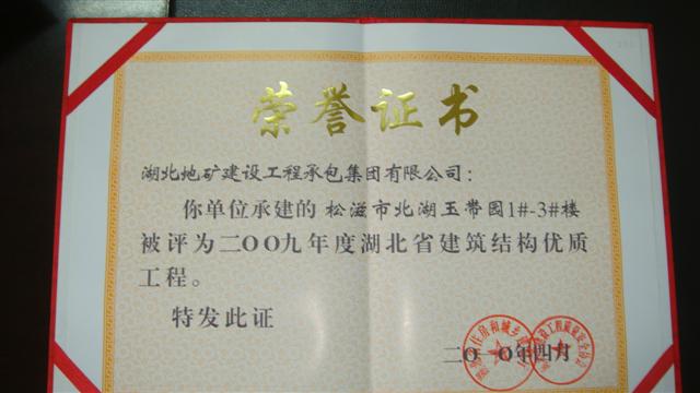 近日,在2009年度湖北省建筑結(jié)構(gòu)優(yōu)質(zhì)工程評選活動中,由湖北地建承包公司承建的松滋市北湖玉帶園1#-3#樓被湖北省住房和城鄉(xiāng)建設(shè)廳、湖北省建設(shè)工程質(zhì)量安全協(xié)會評為“2009年度湖北省建筑結(jié)構(gòu)優(yōu)質(zhì)工程”。