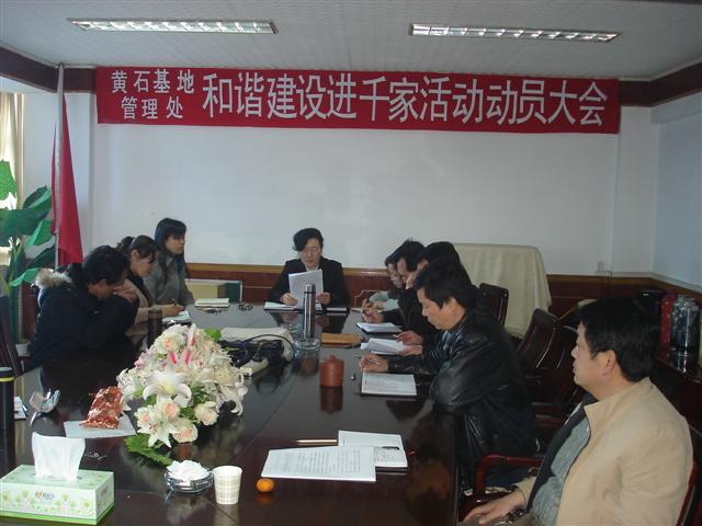 2011年3月25日下午,黃石基地管理處召開了“和諧建設進千家”活動動員大會。會議以“訪民情、辦實事、化矛盾、促和諧”為主題;以結合職工實際、圍繞職工群眾最關心、最直接、最現(xiàn)實的利益問題,努力為職工群眾多辦解民憂、謀民利、化民怨的實事好事為宗旨;圍繞促進和諧基地建設,大力開展“送政策、送健康、送服務、送溫暖”等活動,通過走訪慰問,把黨的關懷與溫暖送到職工群眾手中。該活動分3個工作小組,將分別走訪四個小區(qū),從